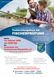Der nächste Vorbereitungskurs auf die Fischerprüfung findet ab dem 10. Februar 2026 in unserem Anglerheim am Hahnentanger See statt. Eine verbindliche Anmeldung bei unseren Ausbildern ist erforderlich. Nähere Informationen erhalten Sie direkt unter folgendem Kontakt: